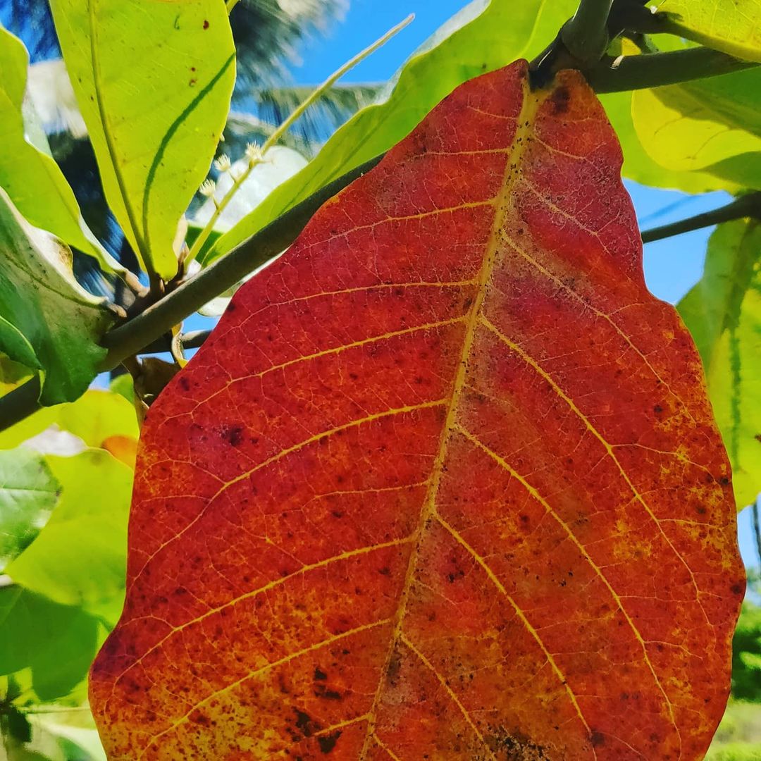 En ce qui concerne les feuilles, les tanins se développent en fin de vie : c’est les tanins qui donnent la couleur jaune orangée de l’automne. En climat tropical, les arbres perdent régulièrement leurs feuilles et pour un arbre comme le Catappa, celles-ci deviennent rouges avant de tomber